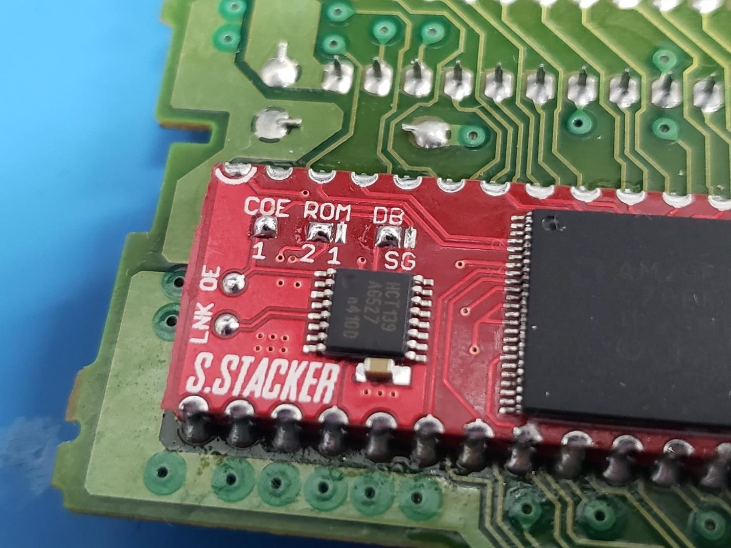 Stack ROM2 over ROM1 and solder the modules. Solder bridge “OE” and “LINK” between both Super Stacker PCBS.
