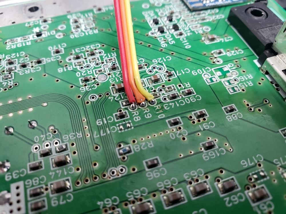 Take 3 of the pre-tinned conductors and solder them into vias R8, R9, and R10.