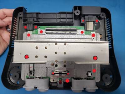 Remove the 14 phillips screws that secure the N64 mainboard and remove the PCB.