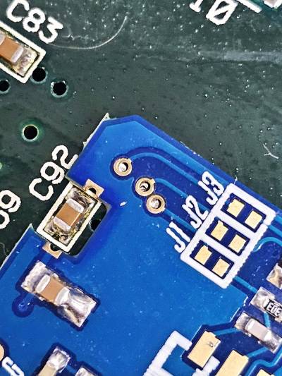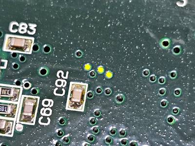 The 3 vias marked in yellow must be exposed by scraping away the solder mask: