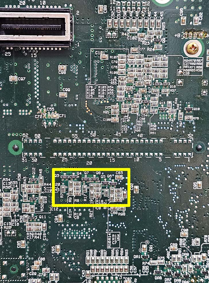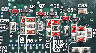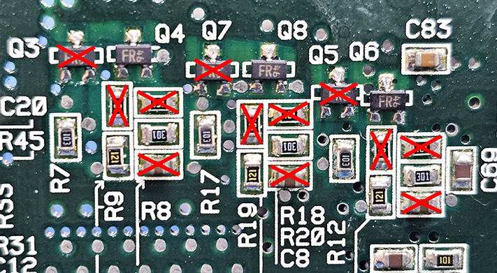 Remove the components: Q3, Q5, Q7, R19, R18, R14, R13, R9, R8, C8, C7, and C6.