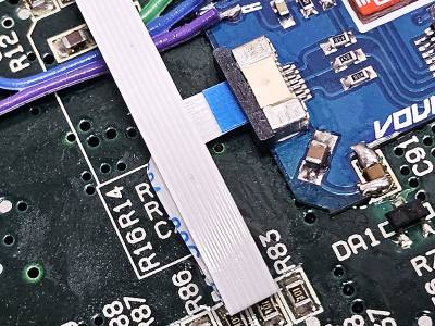 Place the QSB into position and solder the 5 vias, skipping the holes. Insert the FFC (blue tab upward).