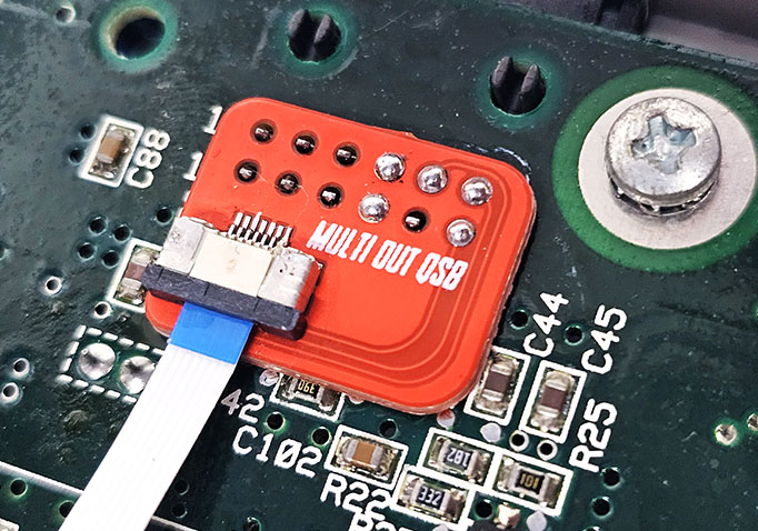 Solder the Multi-Out QSB over the pins of the Multi-Out so that we can connect the interposer directly via an FFC.