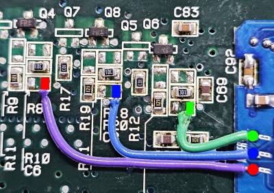 Solder 3 wires from the R, B, and G pads of the SNS-GPM-0X interposer to: C6, C8, and C7 locations on the SNES mainboard as shown.