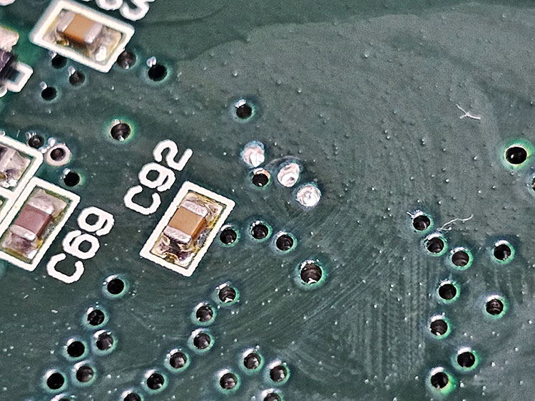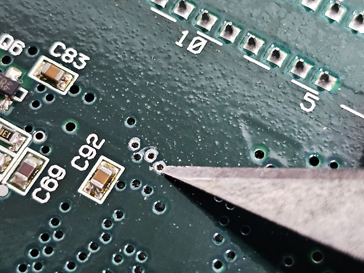 Using a tool such as an x-acto knife, carefully remove the solder mask around the tented vias.