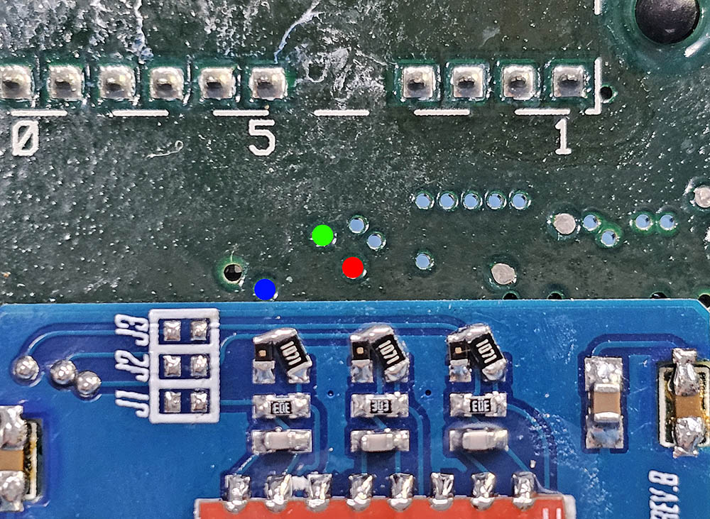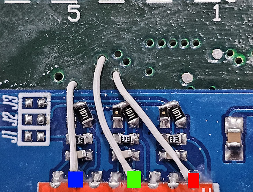 Directly above the interposer, there are 3 vias that will be used to pass three 30 AWG wires to the other side.