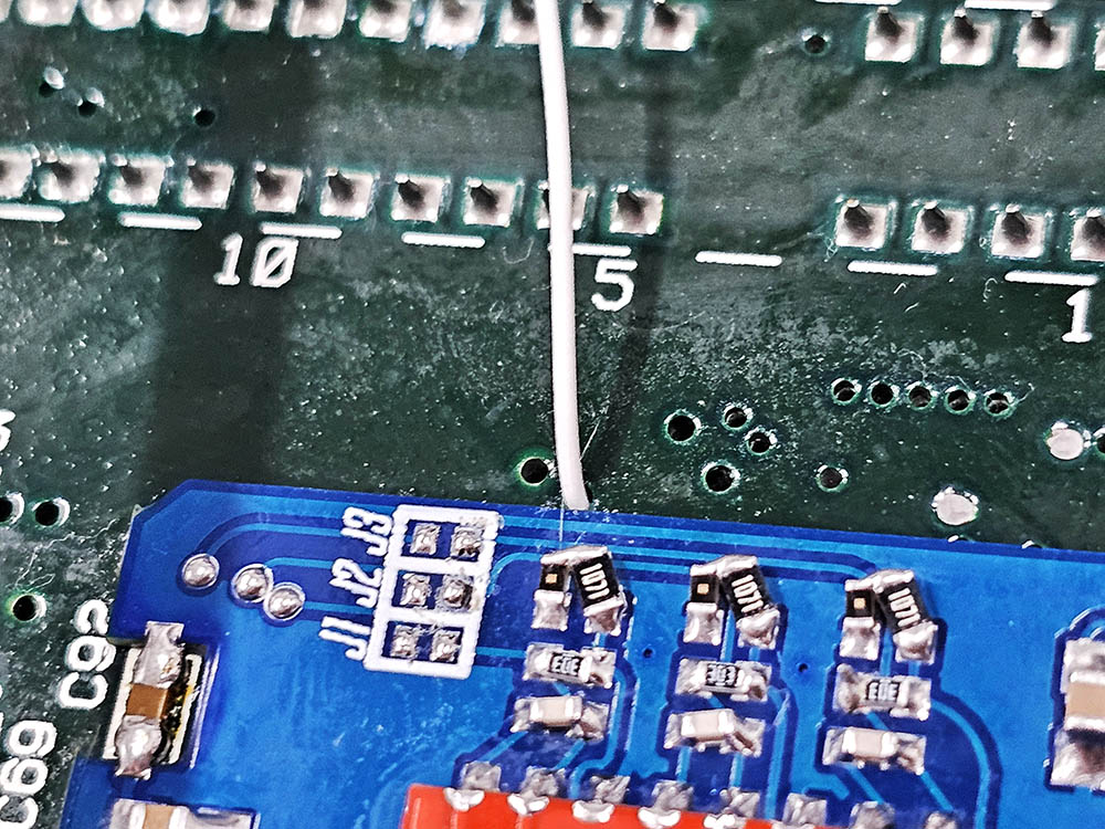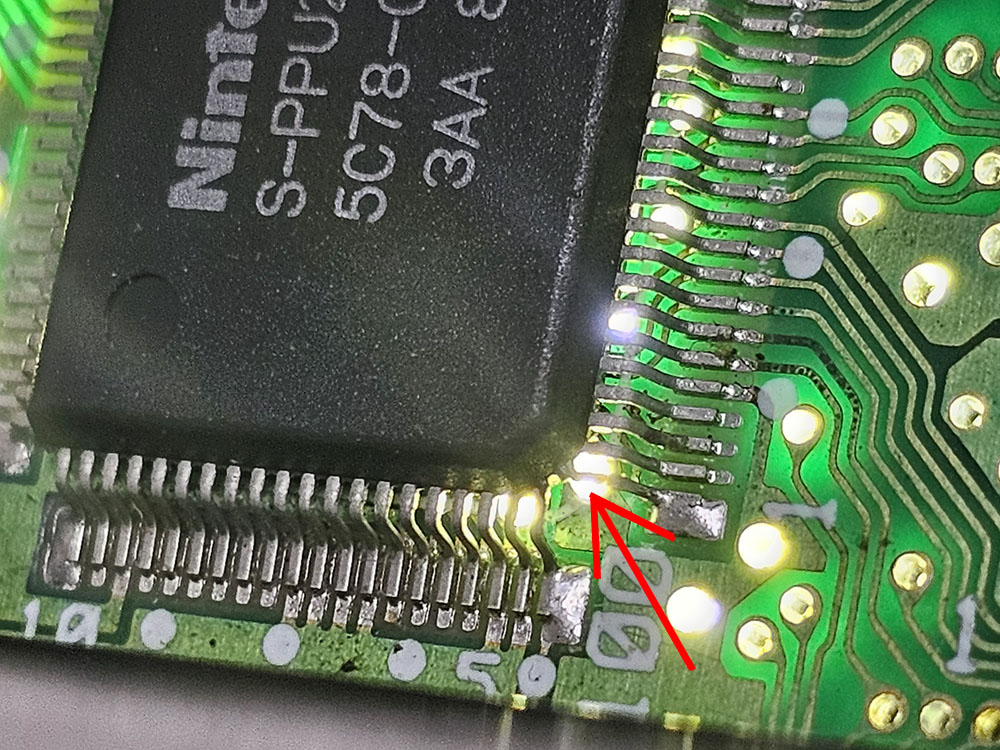 Push the conductor through the via from the bottom of the SNES mainboard and then flip the mainboard.