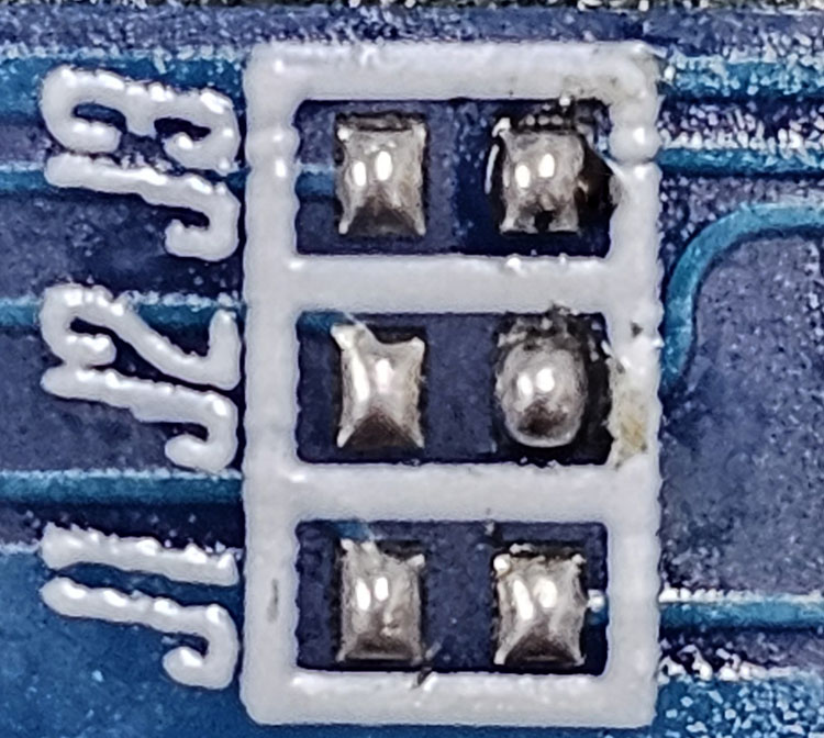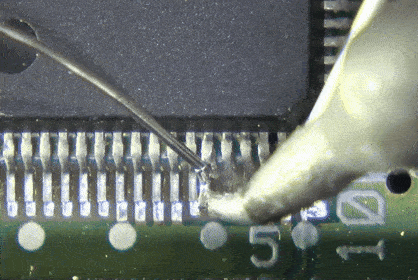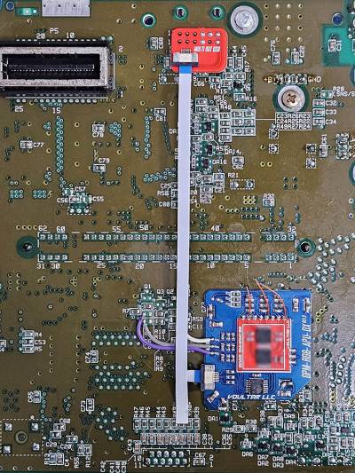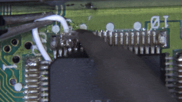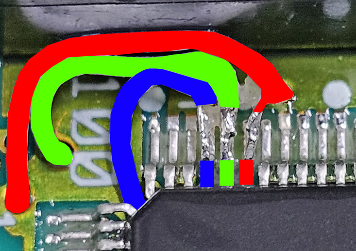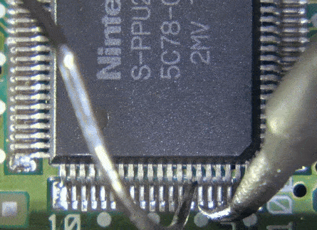 Tin and flux the wire and carefully solder it to lifted PPU2 pin 97. Repeat for pins 95 and 96.