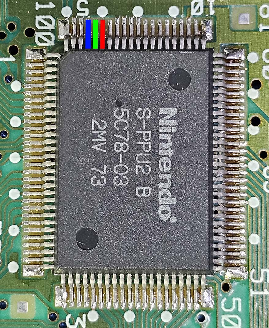 Working with the top of the SNES mainboard, lift PPU2 pins: 97, 96, and 95.